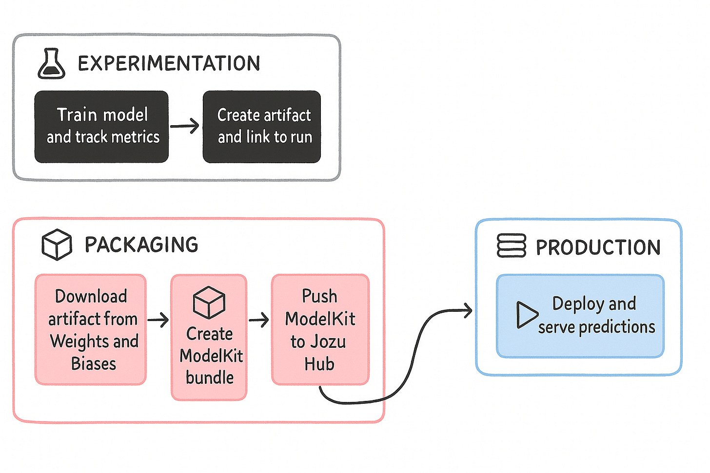 Weights & Biases handles the first phase. KitOps handles the second. Together, they give you a complete lineage.